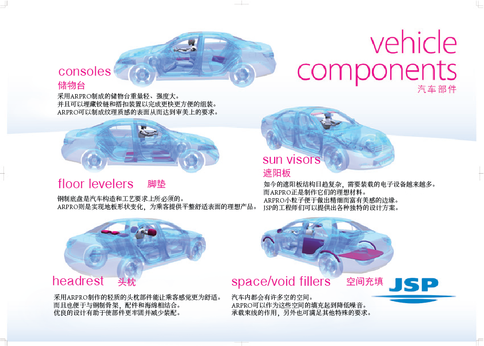 EPP產(chǎn)品具有輕量、高強(qiáng)度的構(gòu)造、隔熱、隔音性能,可以廣泛用于各種車(chē)輛。自從1982年在北美的首次使用保險(xiǎn)杠開(kāi)始,ARPRO便廣泛應(yīng)用于保險(xiǎn)杠、后備箱、遮陽(yáng)板、腳踏墊,座椅芯材等用途上。